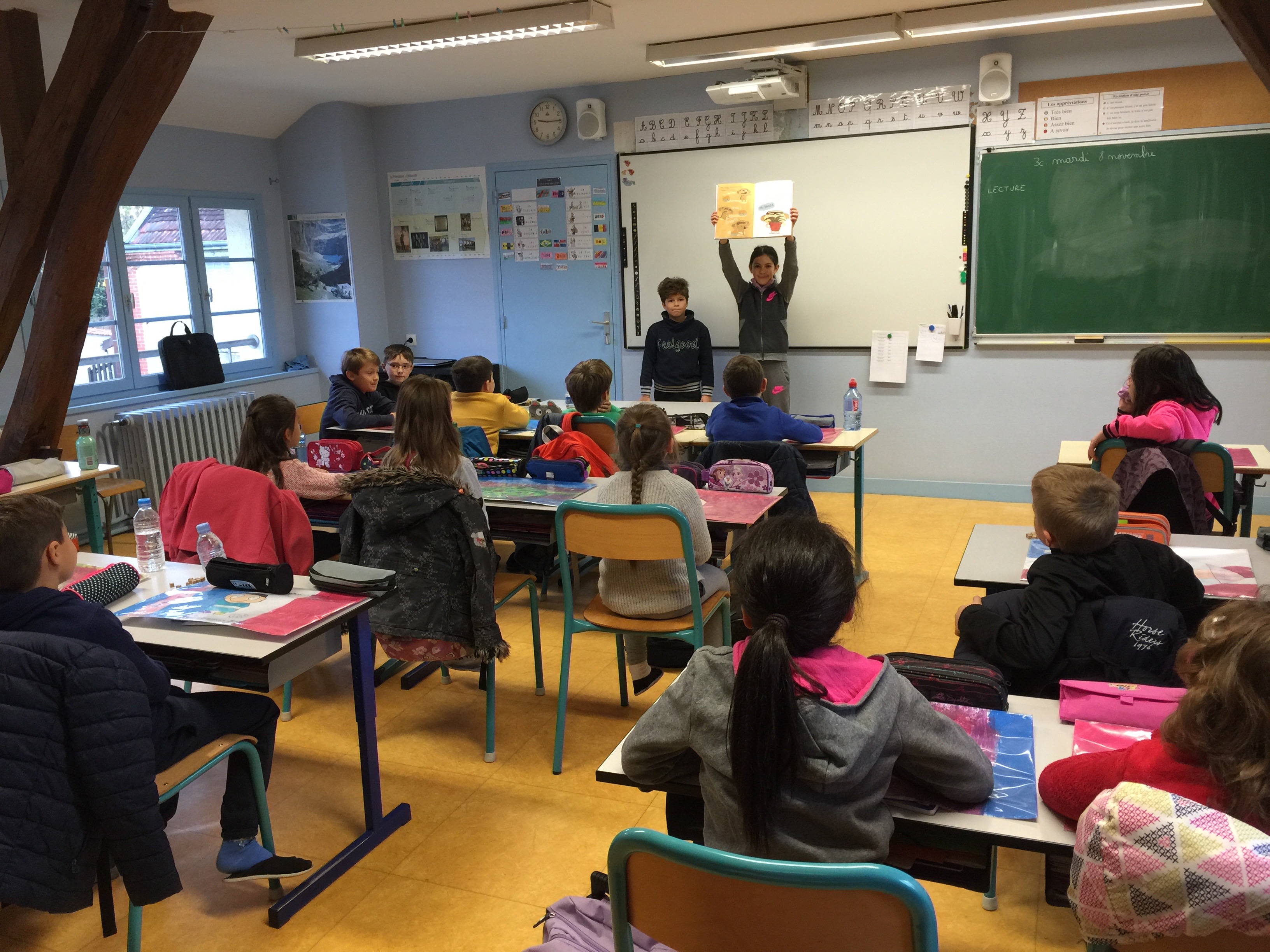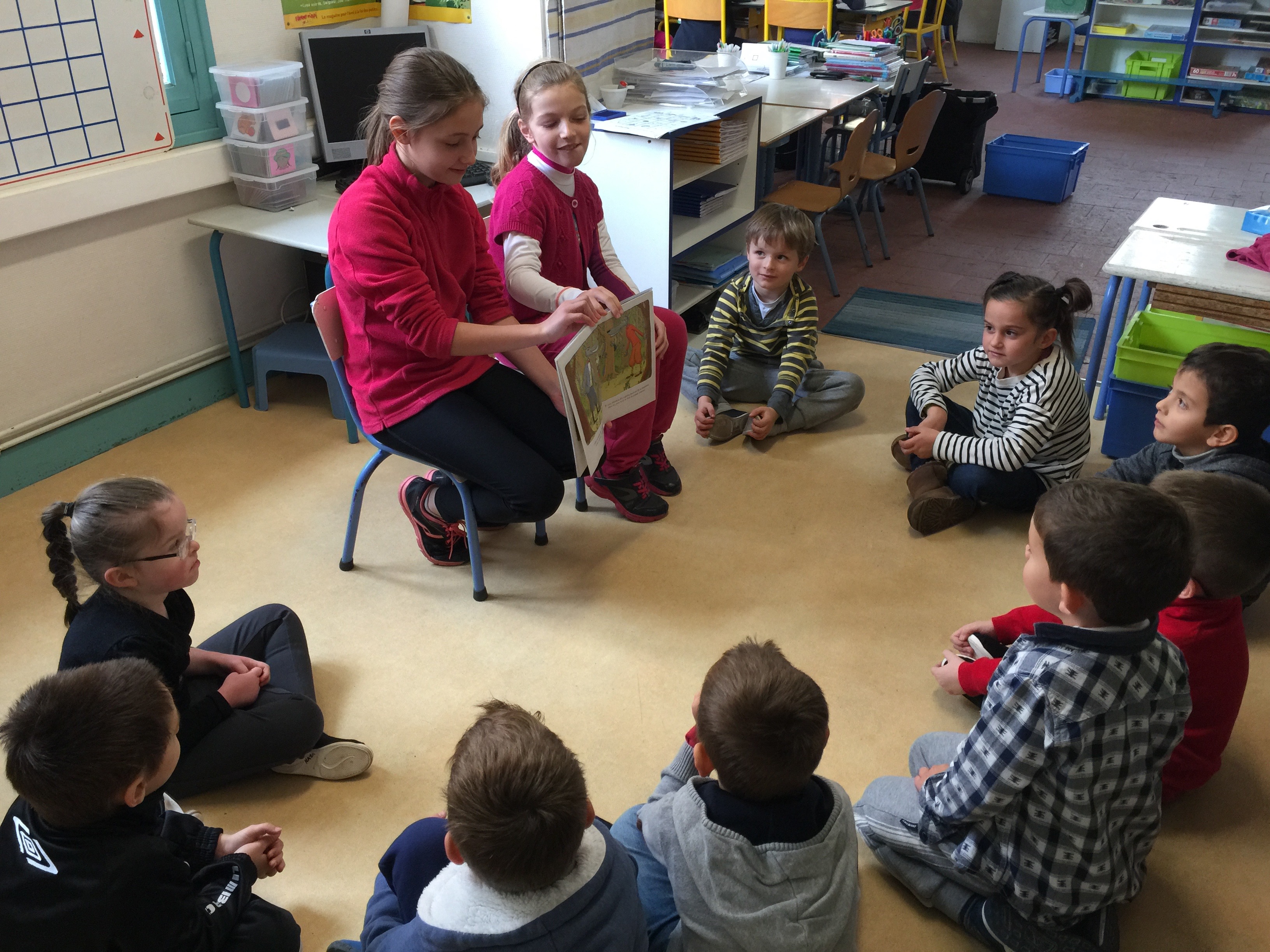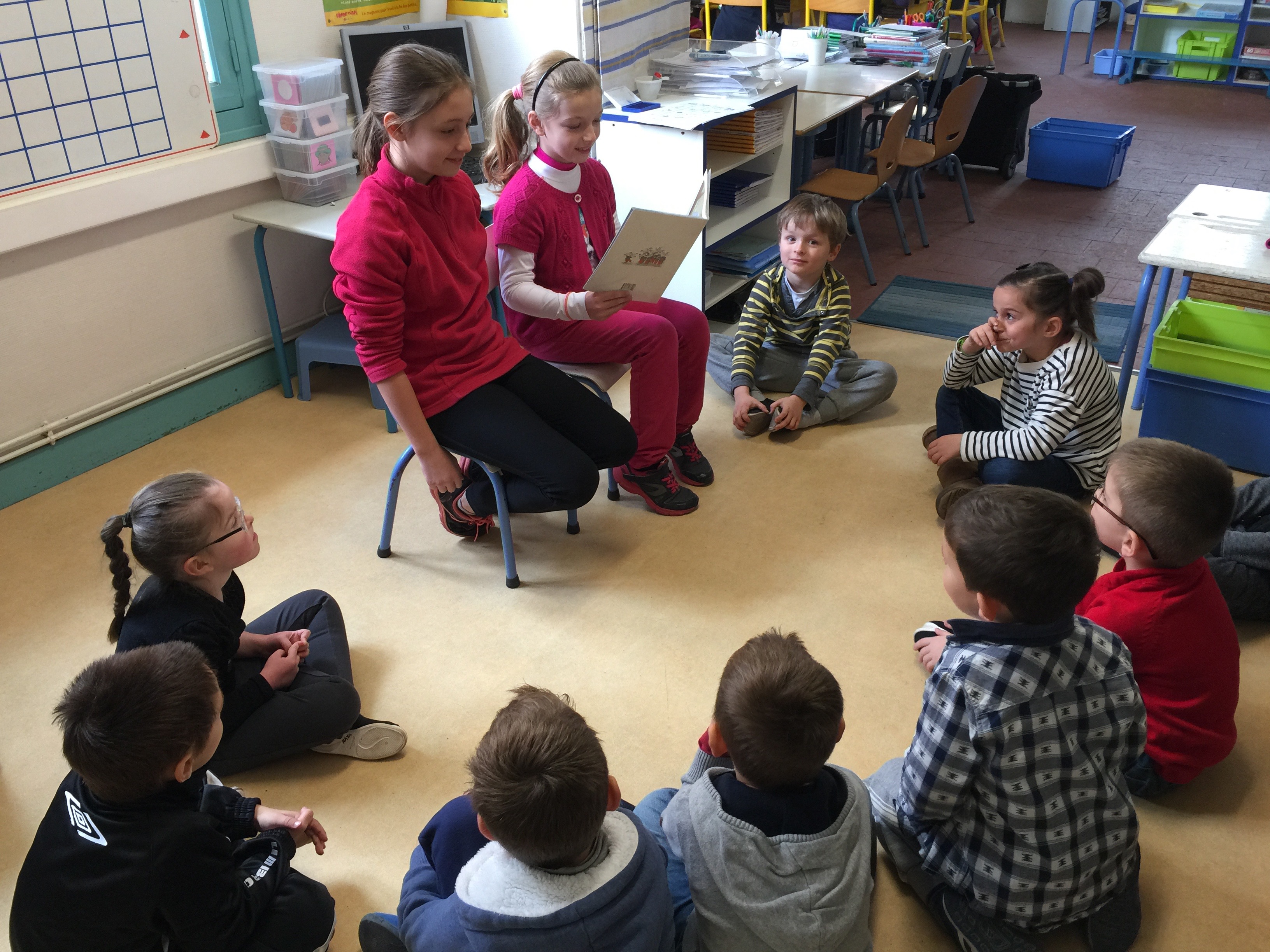 Les vendredis après-midi, des élèves de CM1-CM2 viennent lire une histoire aux élèves des 3 autres classes (maternelle, GS-CP, CE1-CE2).